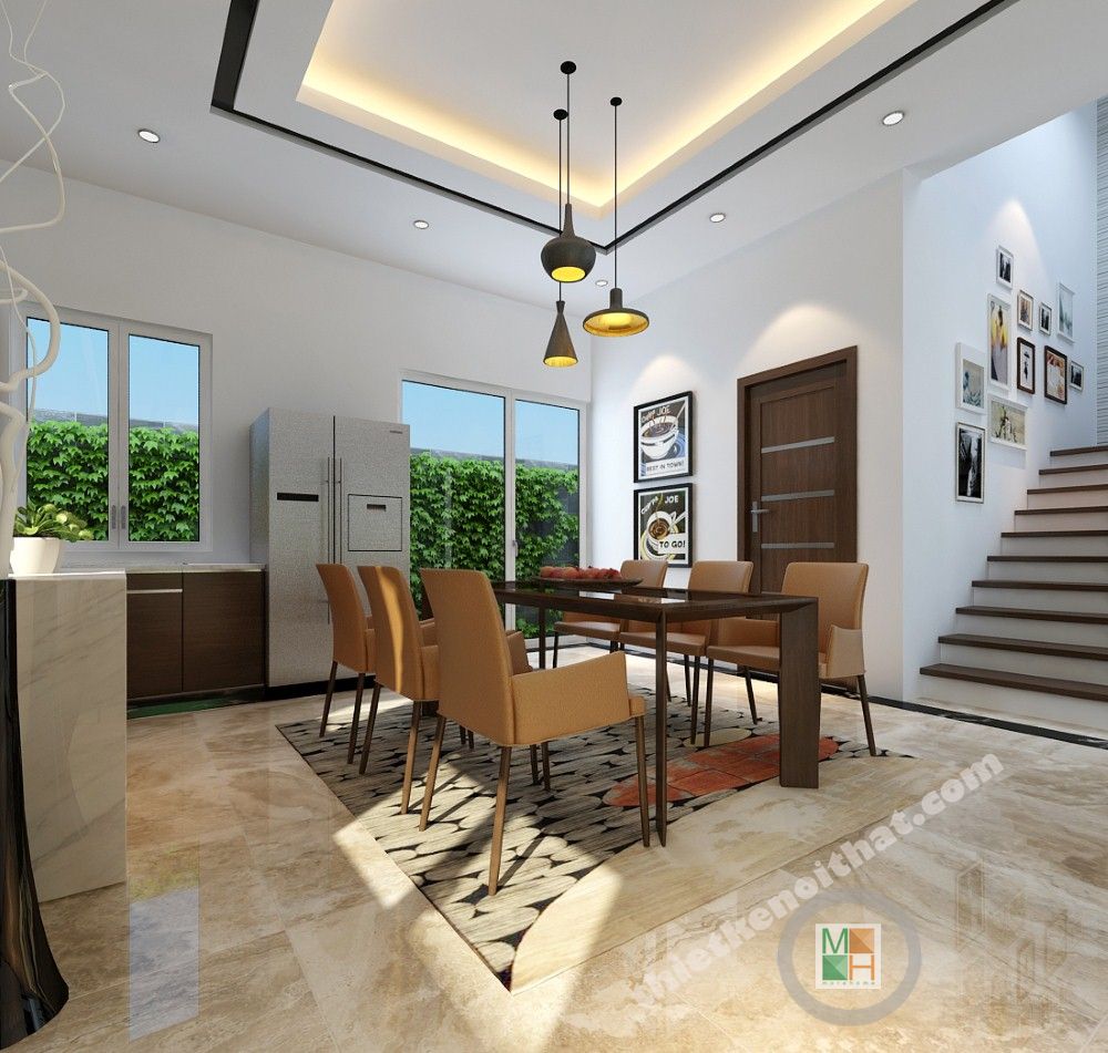 Thiết kế nội thất gian phòng bếp cũng là một điểm nhấn đáng chú ý vì đây được coi như nơi giữ lửa gia đình, nơi người phụ nữ trổ tài nghệ nấu nướng đem đến những món ăn ngon cho gia đình thân yêu nên các kiến trúc sư đã lựa tay chuẩn bị những điều gần gũi và thoải mái nhất cho người phụ nữ. Đó là sự ấn tượng và thoáng đạt của việc sắp xếp cửa sổ và cửa ra vào bằng kính trông ra hàng rào cây xung quanh giúp căn phòng thoáng và mát mẻ. Đồng thời cũng trang trí thêm những bức tranh sinh động tạo cảm giác vui vẻ cho căn phòng.