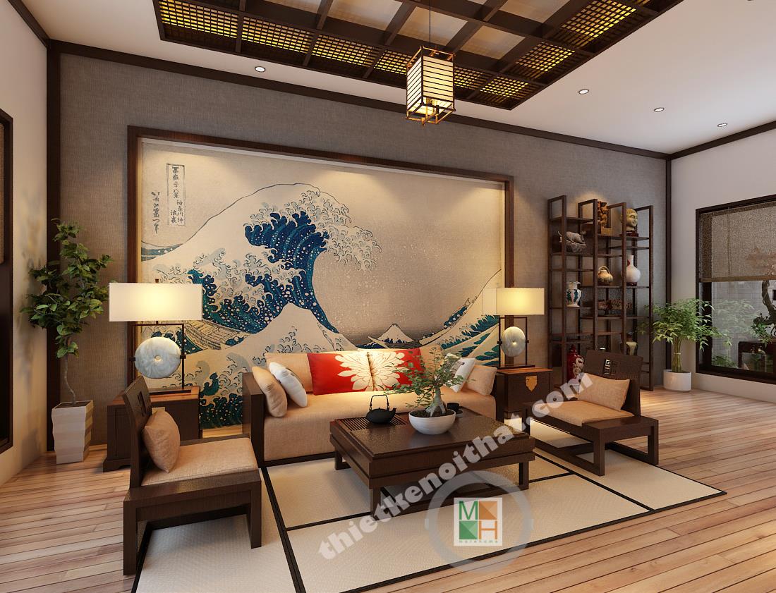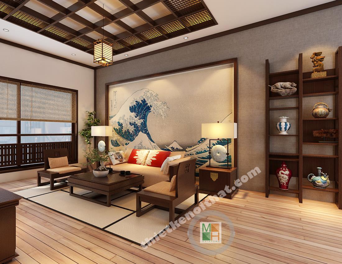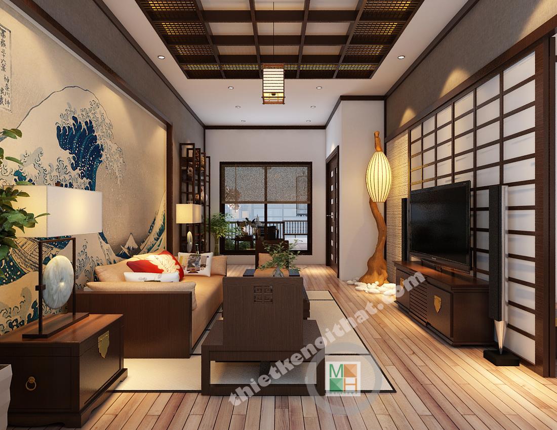 Phòng khách của căn hộ sử dụng đan xen cặp màu trắng - nâu, tạo sự tương phản để giúp ta cả nhận được những điểm nhấn từ các chi tiết kiến trúc hay đồ trang trí. Bộ bàn ghế tiếp khách được làm bằng gỗ có kiểu dáng khá thấp thể hiện phong cách thiết kế tối giản. Các đồ nội thất và trang trí khác trong phòng cũng sử dụng gỗ làm chất liệu chính như kệ tivi, khung tranh, kệ đồ... Sở dĩ có nhiều đồ gỗ như vậy là do kiến trúc Nhật Bản là sự giao hòa giữa môi trường thiên nhiên với con người. Góc phòng cũng có một chậu cây cảnh để thể hiện sự hòa hợp, tôn trọng tự nhiên, đồng hành với thiên nhiên trong hành trình sống của đời người. Bức tranh sóng nước ở mảng tường phía sau tạo điểm nhấn cho gian phòng và cũng rất hợp phong thủy. Tấm thảm kê ở giữa phòng mô phỏng theo những tấm đệm cói dùng để ngồi uống trà của người Nhật, gọi là "Tatami".