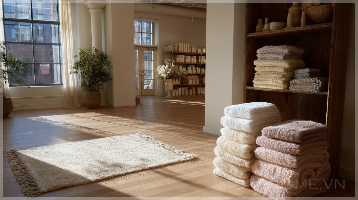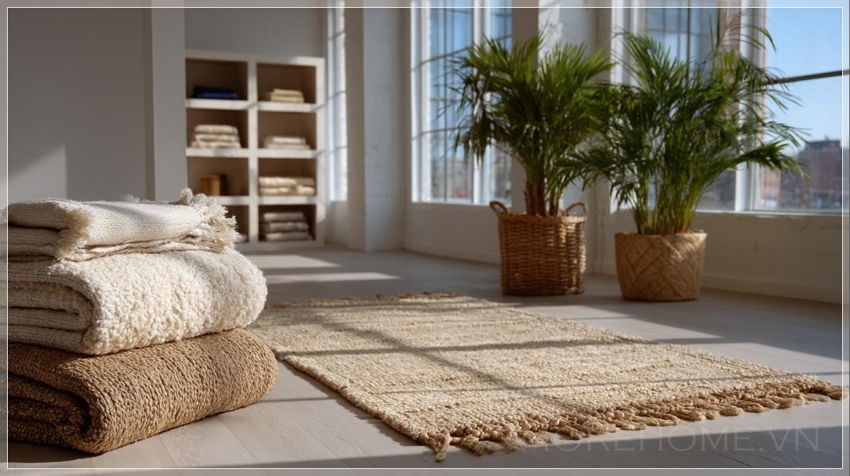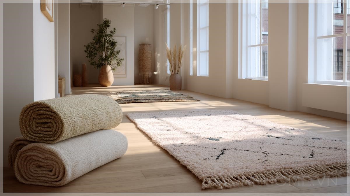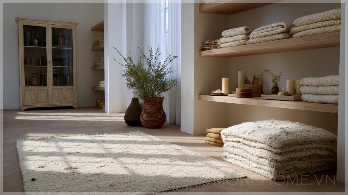 Một bộ sưu tập thảm Maroc được gập lại hoặc cuộn lại, với tông màu trung tính mềm mại, được đặt trong một không gian triển lãm tối giản hoặc phông nền sạch sẽ, với ánh sáng bóng mờ và cảm giác cao cấp.