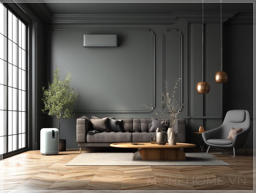 Phòng khách hiện đại theo phong cách đương đại, với thiết kế tối giản và tinh tế. Phòng có một chiếc máy hút ẩm được chọn lựa kỹ càng để phù hợp với tổng thể nội thất, mang tính thẩm mỹ cao nhưng vẫn hòa hợp vào không gian chung. Chiếc máy hút ẩm này là điểm nhấn của căn phòng, vừa nổi bật vừa hòa quyện một cách hoàn hảo với các yếu tố còn lại của phòng khách. Mọi chi tiết trong căn phòng, từ ghế sofa, bàn trà cho đến hệ thống ánh sáng đều tạo ra một không gian thoải mái, dễ chịu.