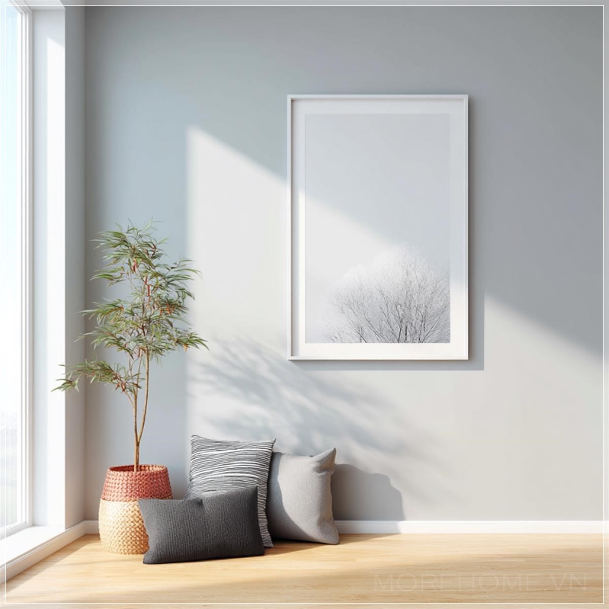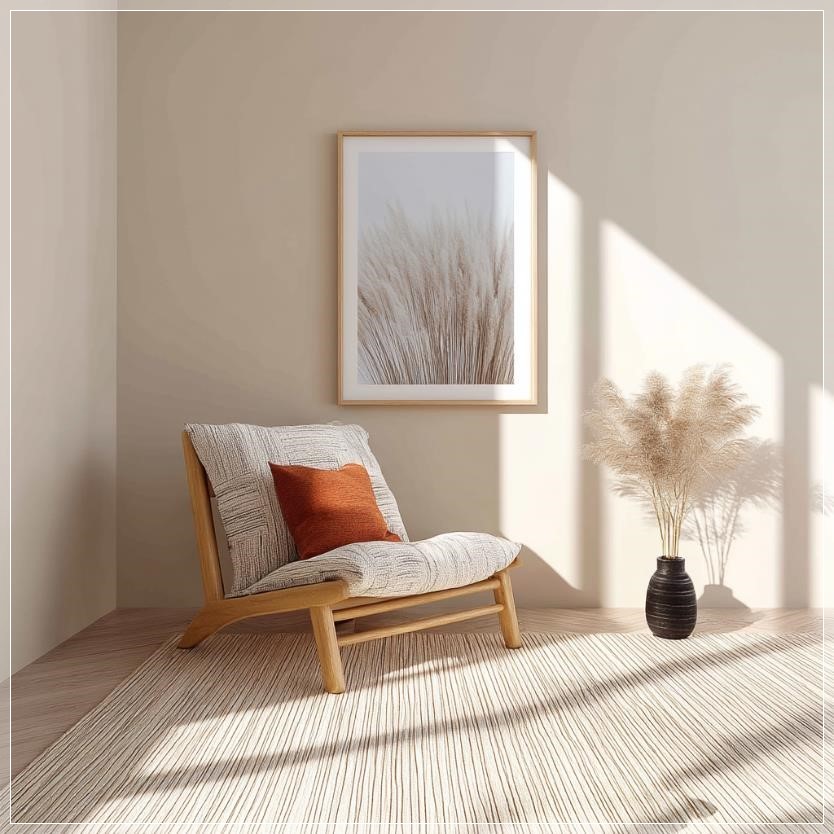 Một mô hình khung tranh trong ngôi nhà hiện đại của IKEA, với chi tiết kết cấu của đồ nội thất, ánh sáng tự nhiên chiếu vào.