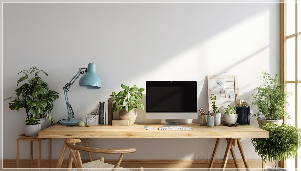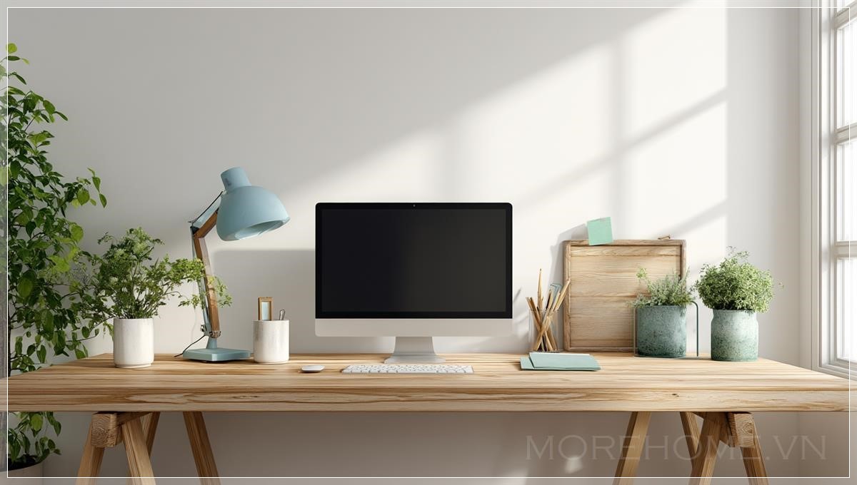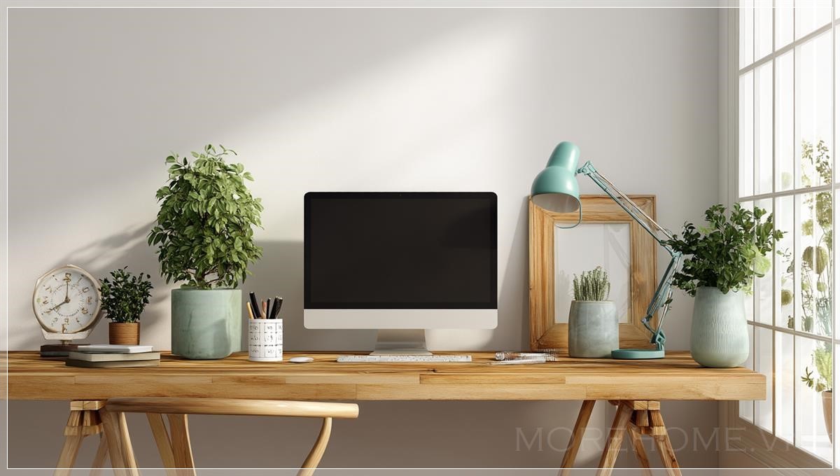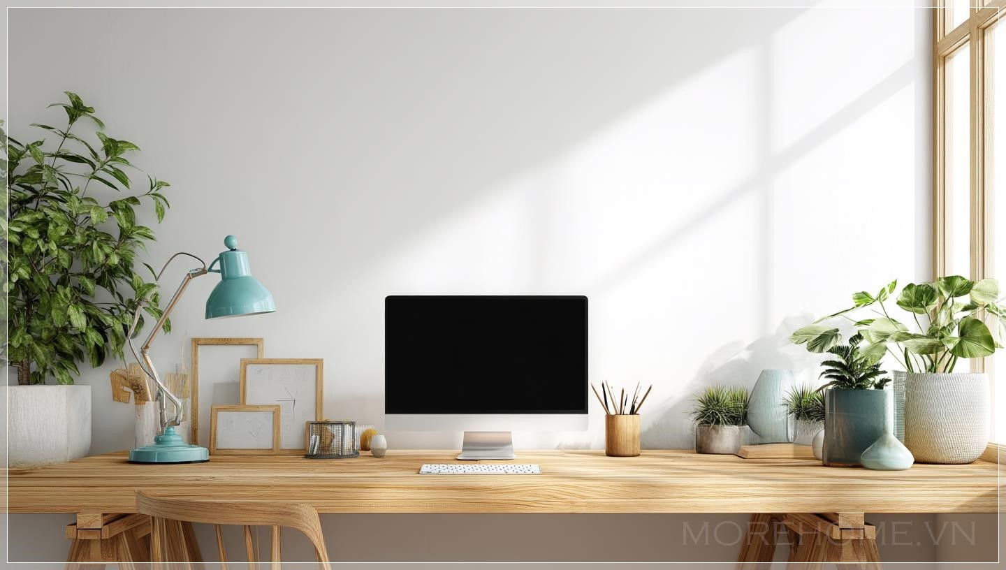 Mẫu thiết kế mô phỏng một bức tường trống trước bàn làm việc, bàn với máy tính và các phụ kiện văn phòng,...