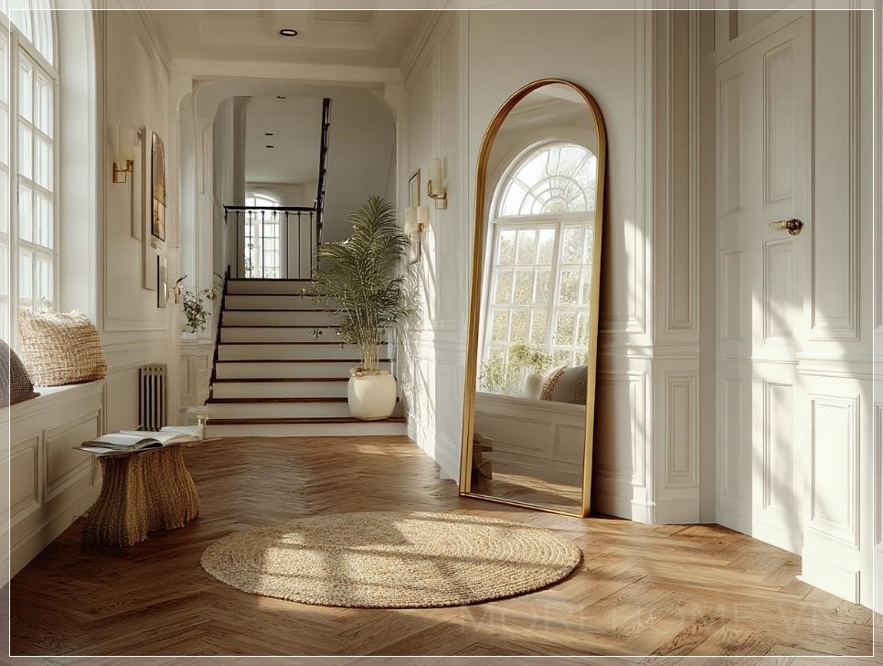 Gương arched cao với khung vàng chải, đặt trong hành lang với tường panelling trắng cổ điển và sàn gỗ...