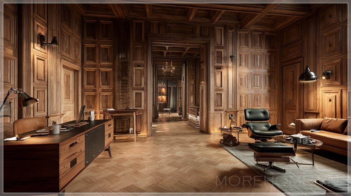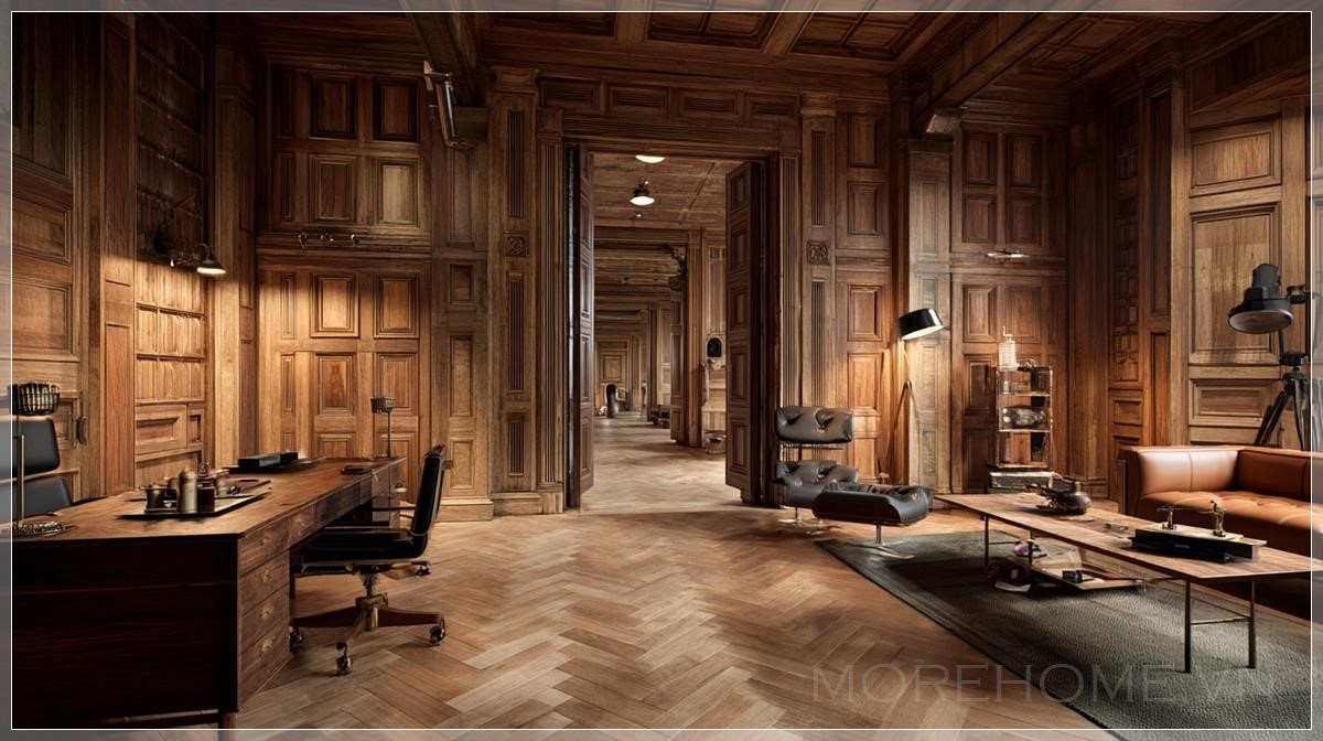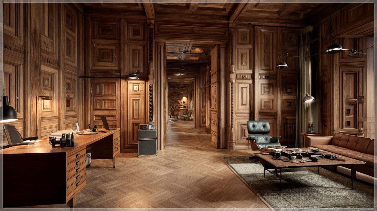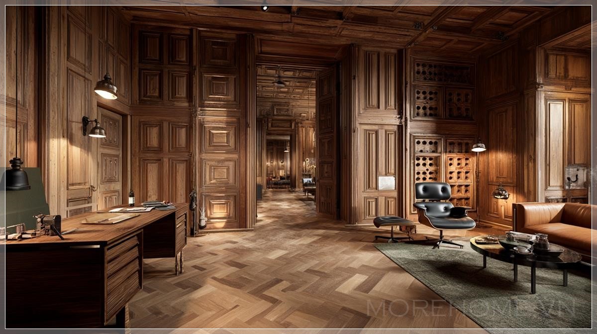 Phòng với tường gỗ, bàn gỗ, phong cách phim Kingsman, ảnh siêu thực.