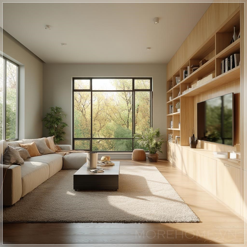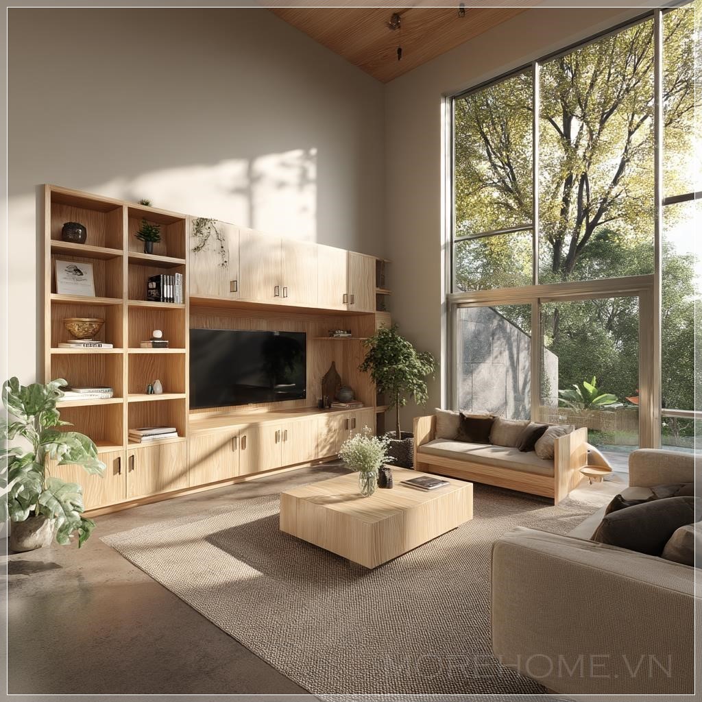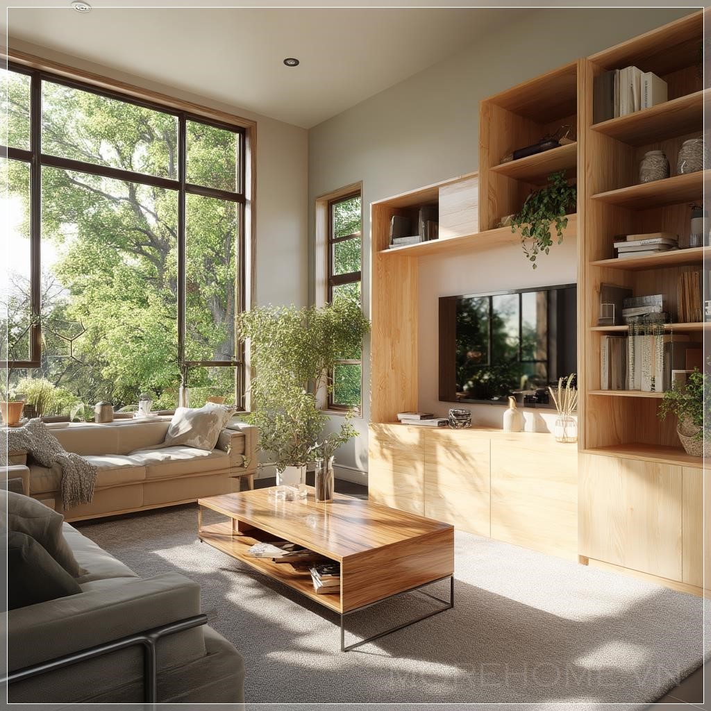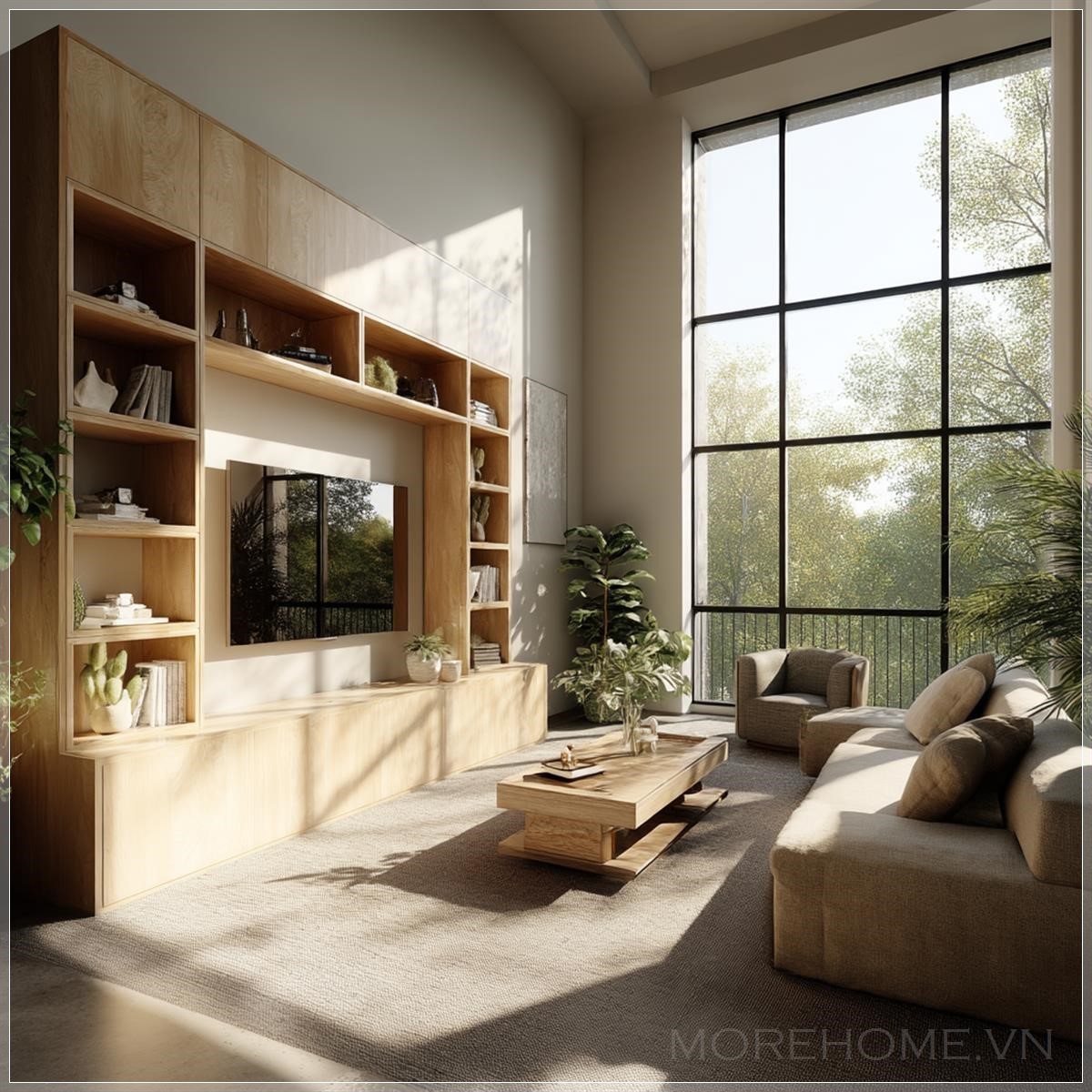 Phòng khách hiện đại với tủ gỗ sáng màu, một chiếc sofa và TV đặt ở trung tâm không gian. Các bức tường có cửa sổ lớn, nhìn ra cây cối bên ngoài. Ánh sáng ấm áp chiếu qua cửa kính, làm sáng toàn bộ không gian bên trong. Sàn nhà có thảm, một bàn cà phê, kệ sách và một số cây trang trí được đặt xung quanh. Kết xuất Unreal Engine, thiết kế chi tiết, render nội thất, kiến trúc nội thất, chủ nghĩa tối giản, phong cách như một bức ảnh thực tế.