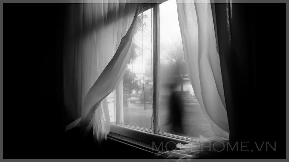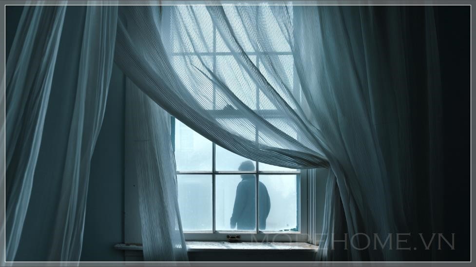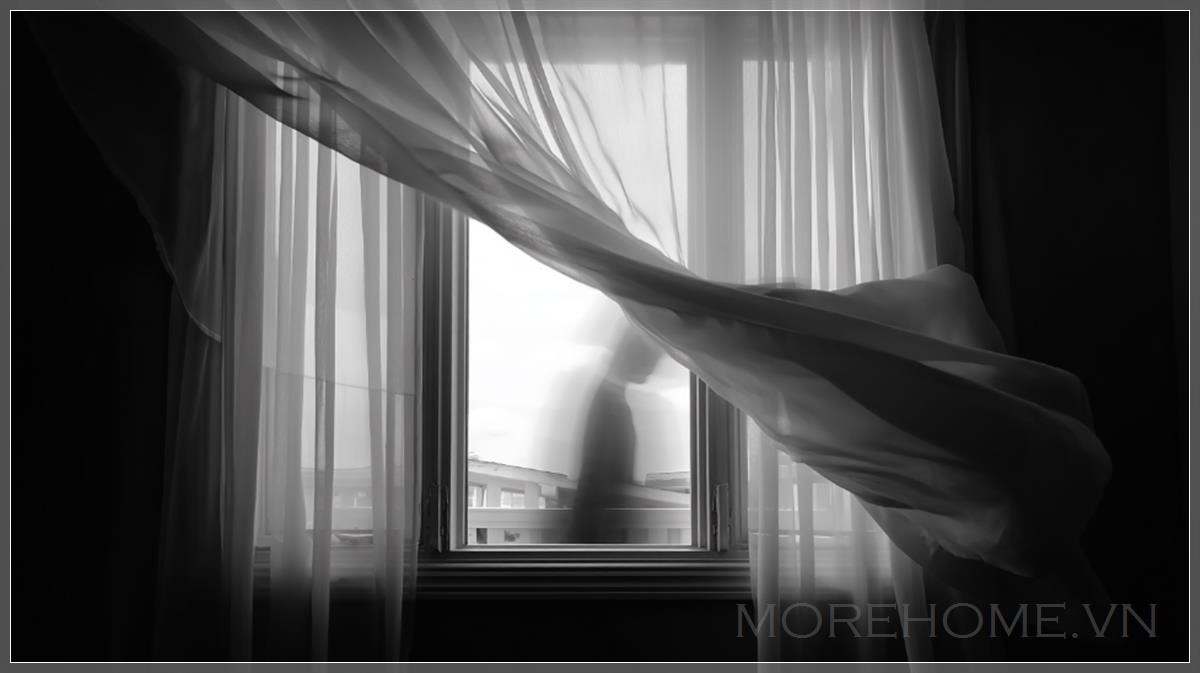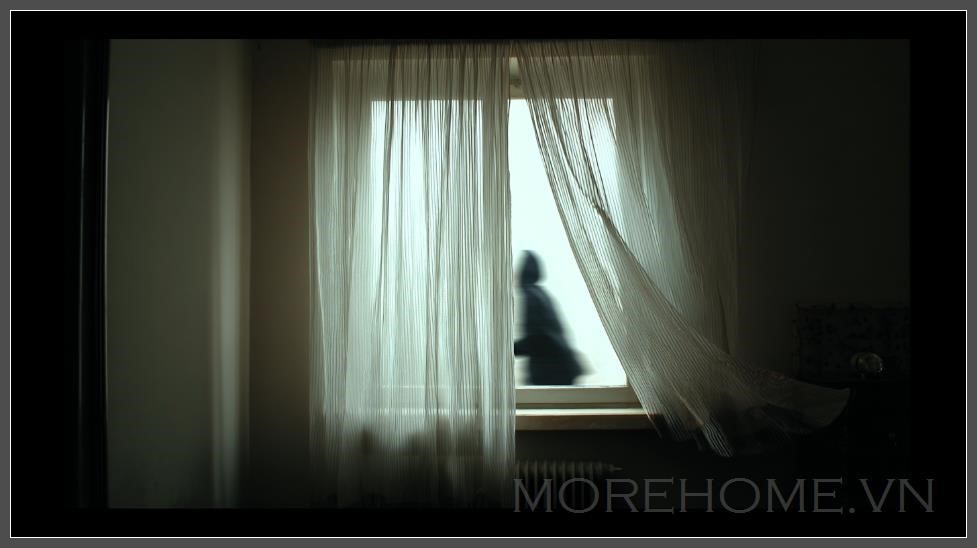 Một cửa sổ mở với rèm trắng mỏng nhẹ nhàng bay trong chuyển động chậm. Hình bóng của một người mờ ảo phía sau rèm, di chuyển nhẹ nhàng. Cơn gió mạnh hơn cả thế giới xung quanh.