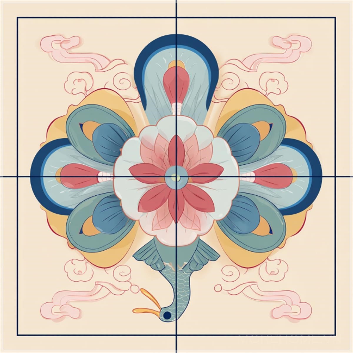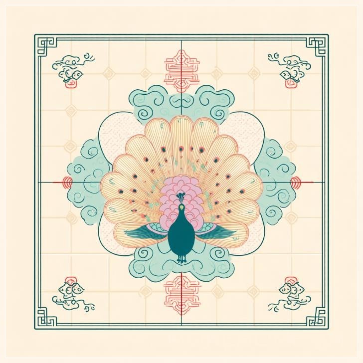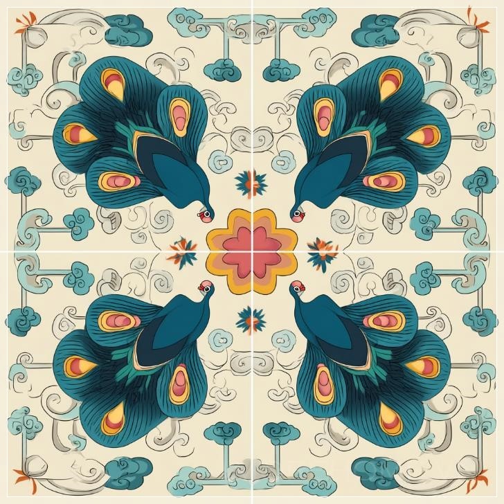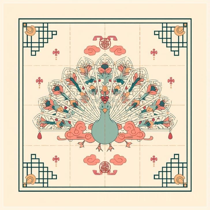 Trong không gian của thiết kế đồ họa hiện đại, một mẫu hình bốn ô vuông liên tục, kết hợp giữa yếu tố Trung Hoa truyền thống và sự tinh tế của lối minh họa vector hiện đại, mang đến một cái nhìn mới mẻ nhưng vẫn giữ được nét đẹp cổ điển. Cảm hứng chính từ hình ảnh con công mở cánh, được phác họa bằng những đường nét mảnh mai và chi tiết tinh xảo, làm nổi bật sự cân đối trong việc sử dụng các yếu tố đối xứng.