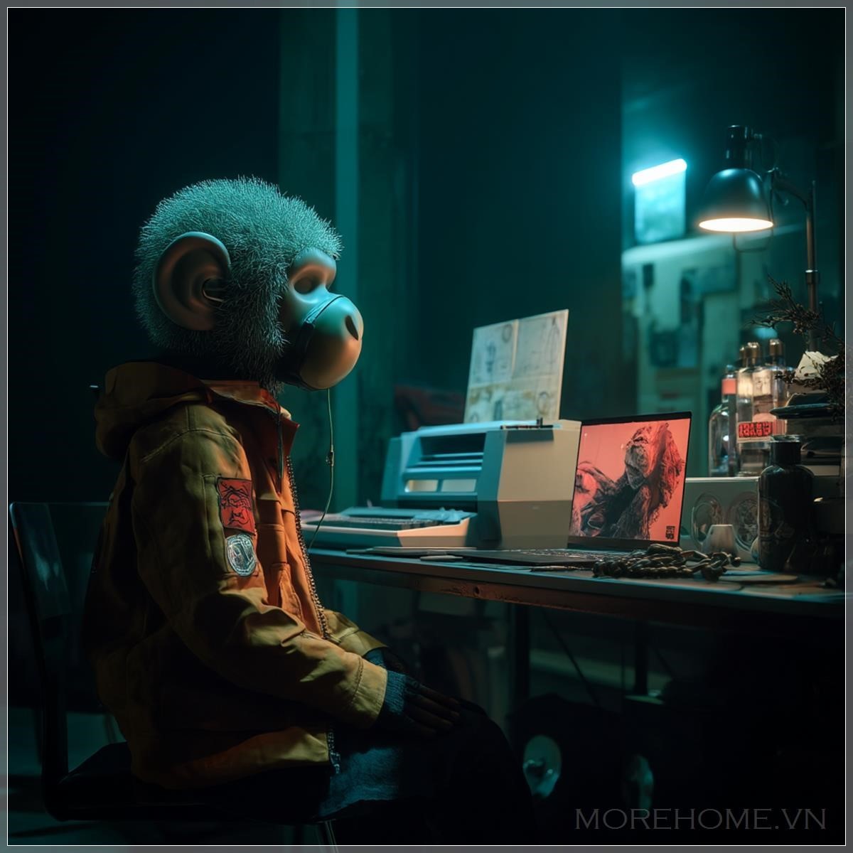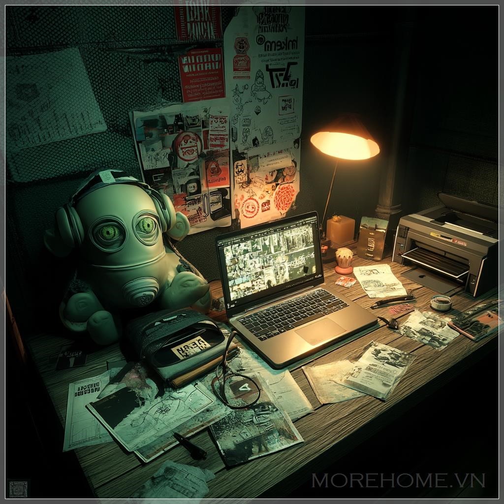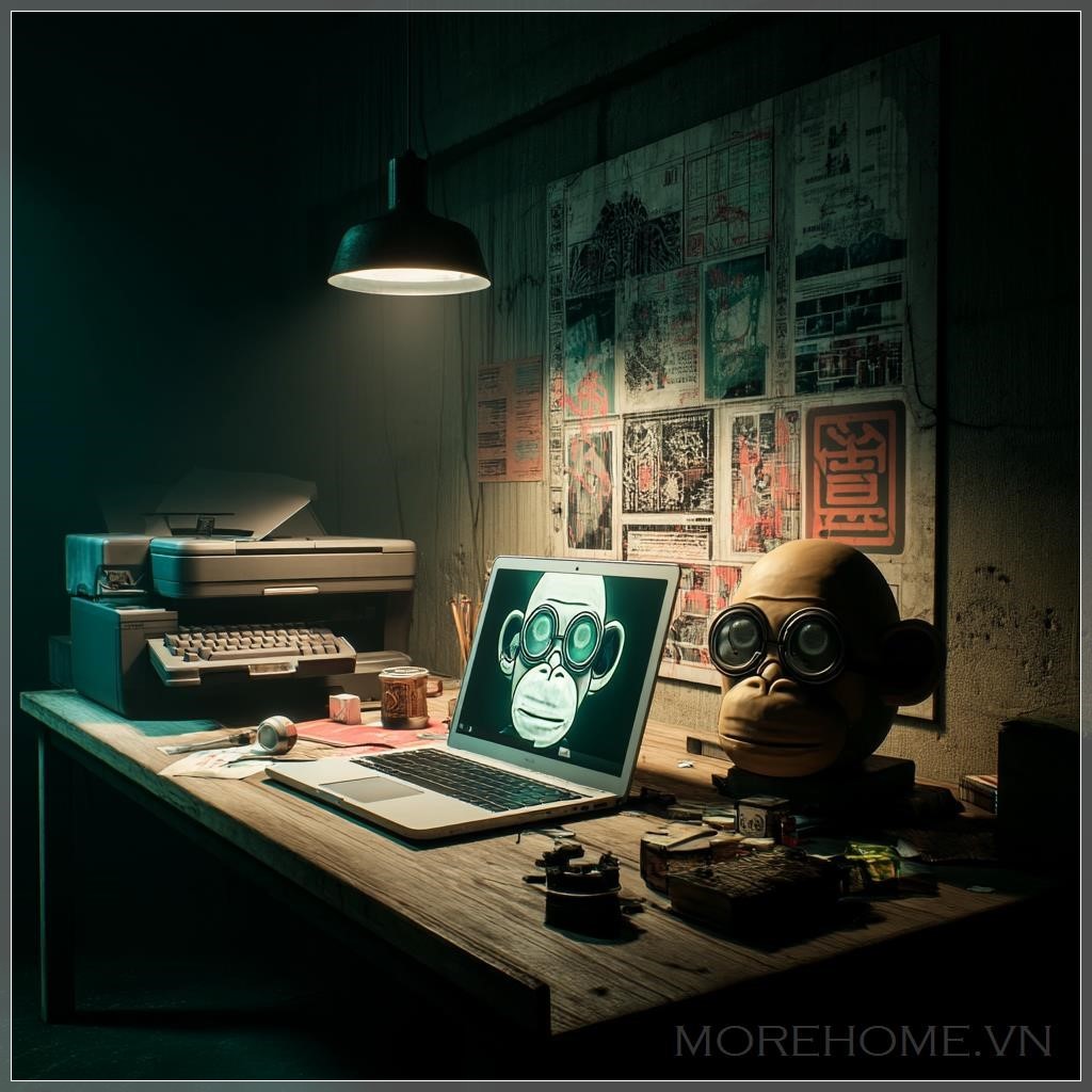Nhìn quanh phòng, một chiếc mặt nạ Monkey Hope nằm gần đó, ánh sáng chiếu lên mặt nạ, làm nổi bật hình dáng kỳ lạ của nó. Đôi mắt màu xanh lục của mặt nạ phản chiếu ánh sáng từ máy tính, tạo nên một cảnh tượng vừa quen thuộc, vừa xa lạ. Căn phòng này, tuy đơn giản, lại chứa đựng một không khí rất đặc biệt, như thể đang chờ đón một điều gì đó lớn lao hơn sắp xảy ra.