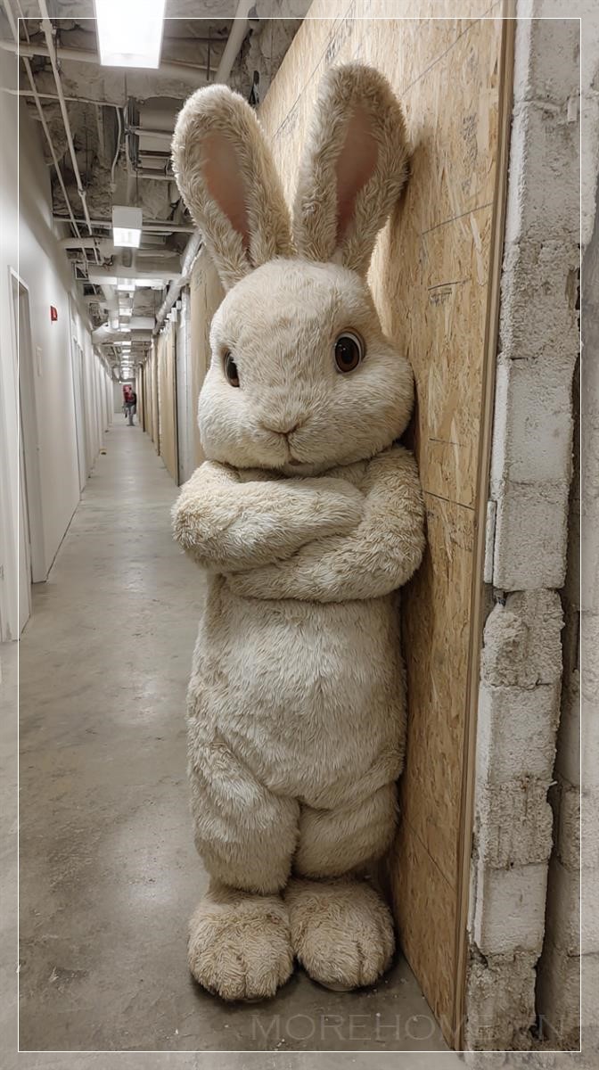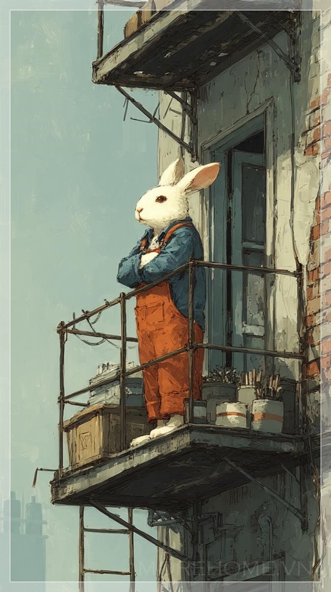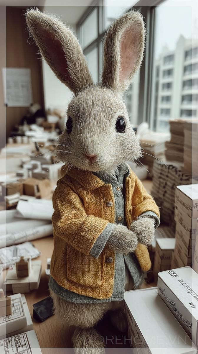 Trên nền căn hộ cũ kỹ nơi ánh nắng buổi sáng lách qua khung cửa sổ cũ, chú thỏ kiến trúc sư – với bộ vest linen màu xám tro, đôi kính gọng tròn và cây bút chì gài trên tai – đứng giữa đống bản vẽ và tiếng ồn của máy khoan, quan sát từng chi tiết với ánh mắt chuyên nghiệp và đầy nhiệt huyết. Chiếc đuôi nhỏ khẽ lay khi chú điều phối nhóm thi công, nhấn mạnh từng điều chỉnh trong bản thiết kế như một nhạc trưởng điều khiển bản giao hưởng kiến trúc sống động.