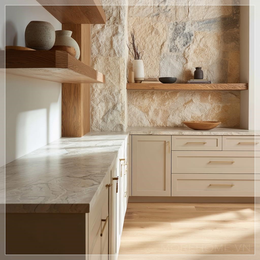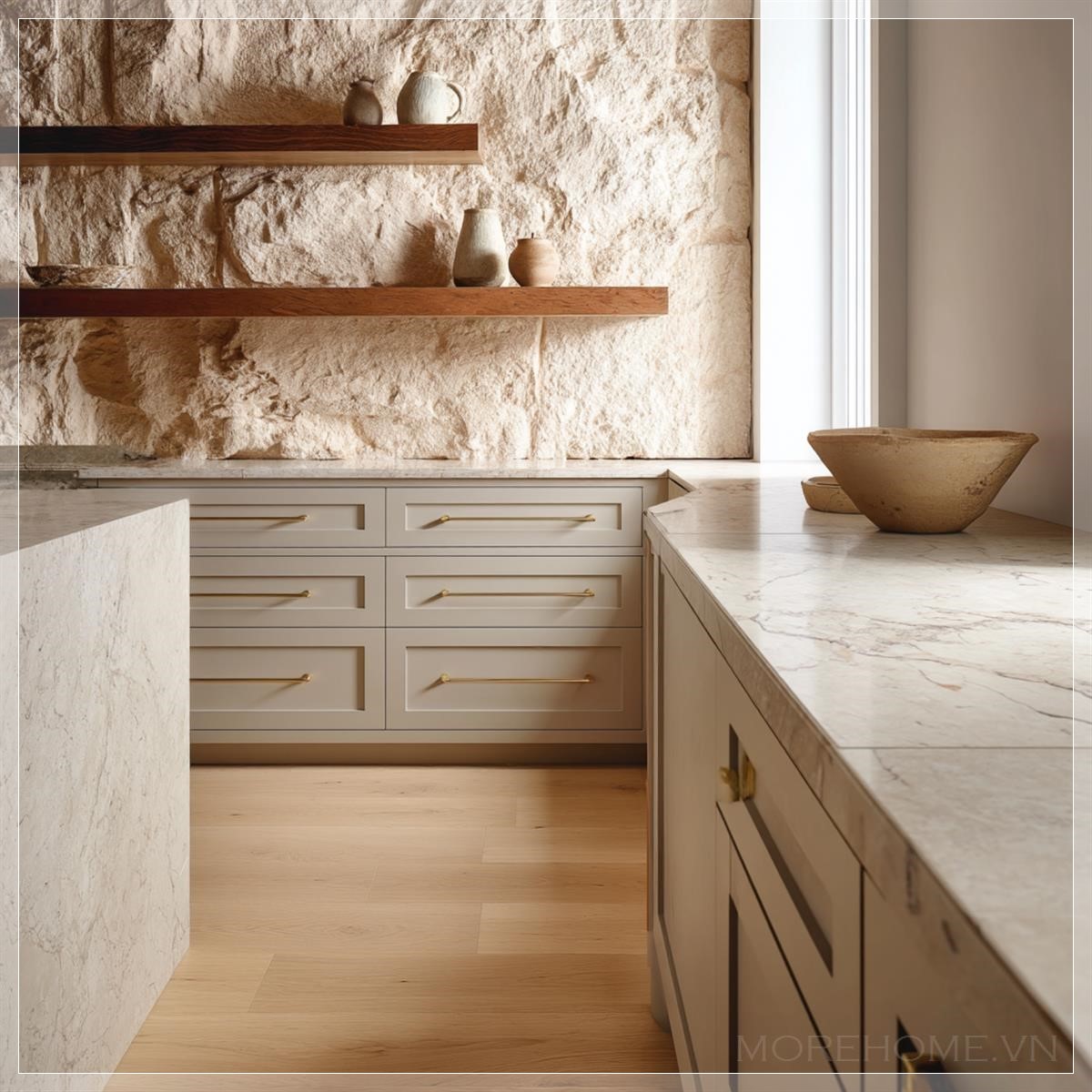 Trong không gian bếp mộc mạc nhưng đầy tinh tế này, ánh sáng nhẹ nhàng phủ lên những bề mặt tự nhiên của đá marble, làm nổi bật những vân đá mềm mại và lớp hoàn thiện mờ đầy quyến rũ. Một góc nhìn từ phía trước, hơi nghiêng, cho phép chúng ta cảm nhận được vẻ đẹp tinh tế của bề mặt bếp, nơi những chiếc tủ shaker màu be nhạt kết hợp cùng tay nắm đồng mờ tạo nên sự hài hòa tuyệt đối.