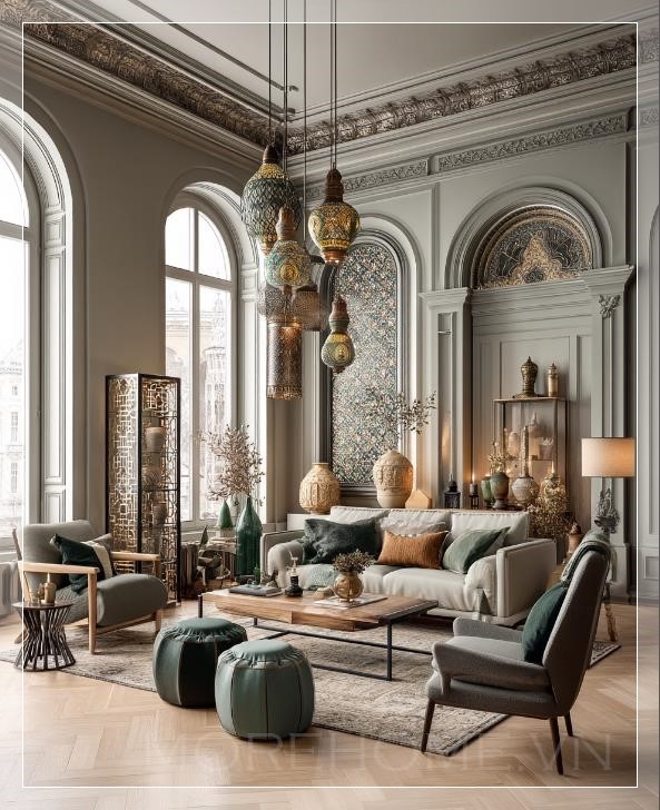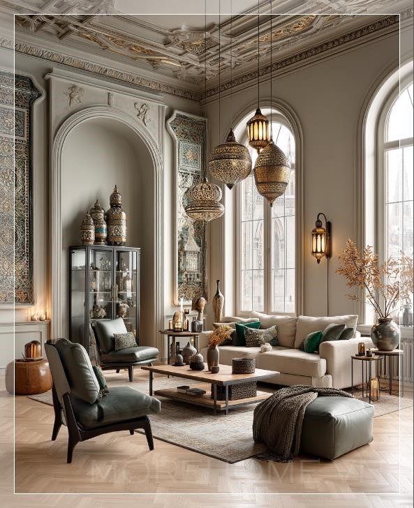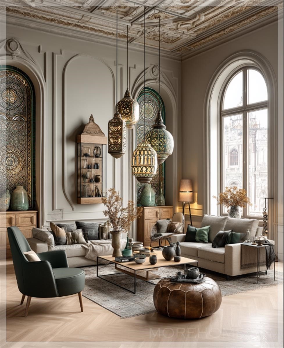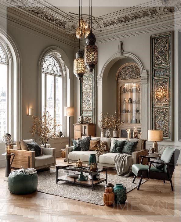 Ánh sáng ấm áp từ đèn chiếu nhẹ nhàng tỏa ra khắp căn phòng, làm nổi bật lên vẻ đẹp của những món đồ nội thất thanh lịch. Đặc biệt, những yếu tố trang trí bằng gốm sứ truyền thống của Romania được bố trí một cách tinh tế, như những chiếc bình gốm nhỏ xinh hay những món đồ thủ công được đặt tại các vị trí dễ nhìn, thêm phần nổi bật cho không gian.