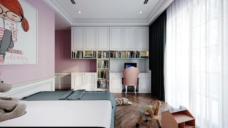 Mẫu thiết kế phòng ngủ bé gái độc đáo với tông màu hồng chủ đạo kết hợp đồ nội thất nhỏ gọn tiện nghi: tủ quần áo âm tường, kệ sách treo, giường ngủ nhỏ nhắn,.. được nhiều gia chủ yêu thích và hướng đến.
