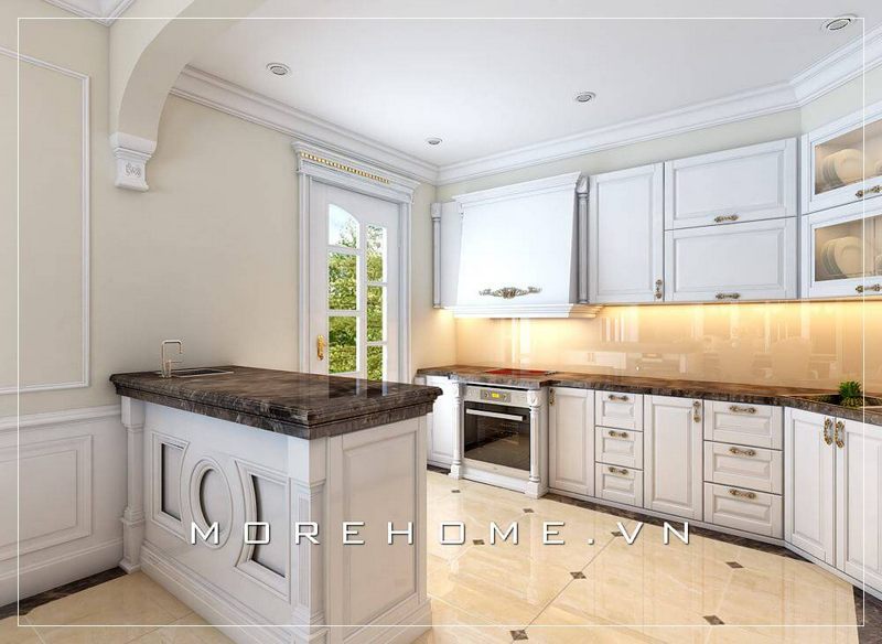 Mẫu bàn đảo bếp gỗ màu trắng, mặt bàn ốp đá màu trắng tạo không gian sạch sẽ và tiện nghi cho người nội trợ