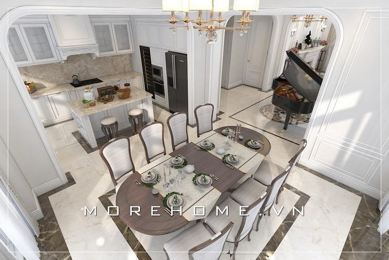Mẫu bàn đảo bếp gỗ tự nhiên, mặt bàn ốp đá màu trắng giúp người nội trợ tiện nghi trong công việc nấu nướng đồng thời tạo vách ngăn giữa phòng bếp và phòng ăn