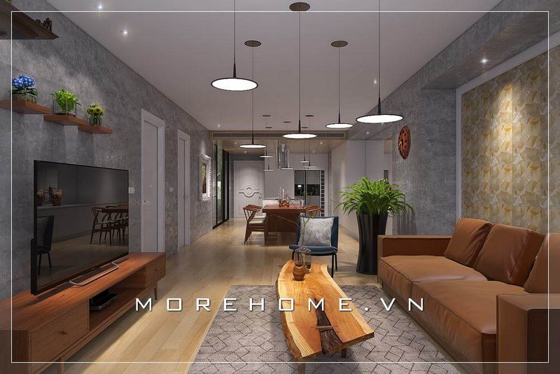 Mẫu thiết kế phòng khách chung cư hiện đại này là sự kết hợp của những bộ sofa da cao cấp, bàn trà gỗ nguyên tấm độc đáo, kệ ti vi gỗ nhỏ gọn kết hợp cách trang trí độc đáo mang đến không gian sống lí tưởng