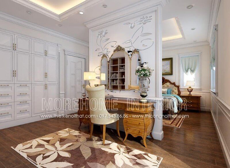 Thiết kế phòng ngủ màu sáng dành cho nữ có bàn trang điểm không gian tiện nghi nội thất được sắp xếp từng khu vực với từng mục đích sử dụng mang lại sự thoải mái nhất trong không gian riêng của mình.