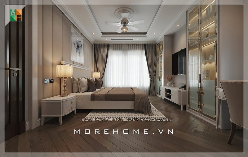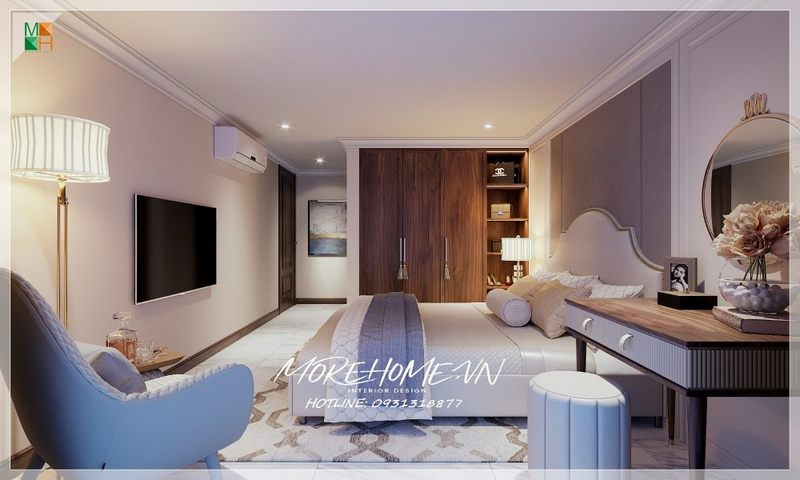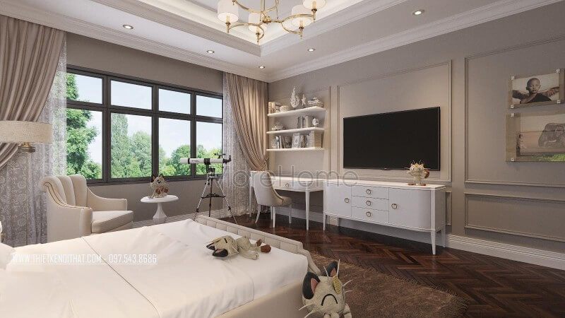 Giường ngủ biệt thự tân cổ điển với những đường nét chạm khắc hài hòa và tối giản nhất tạo nên không gian trang nhã, thanh lịch cho căn phòng