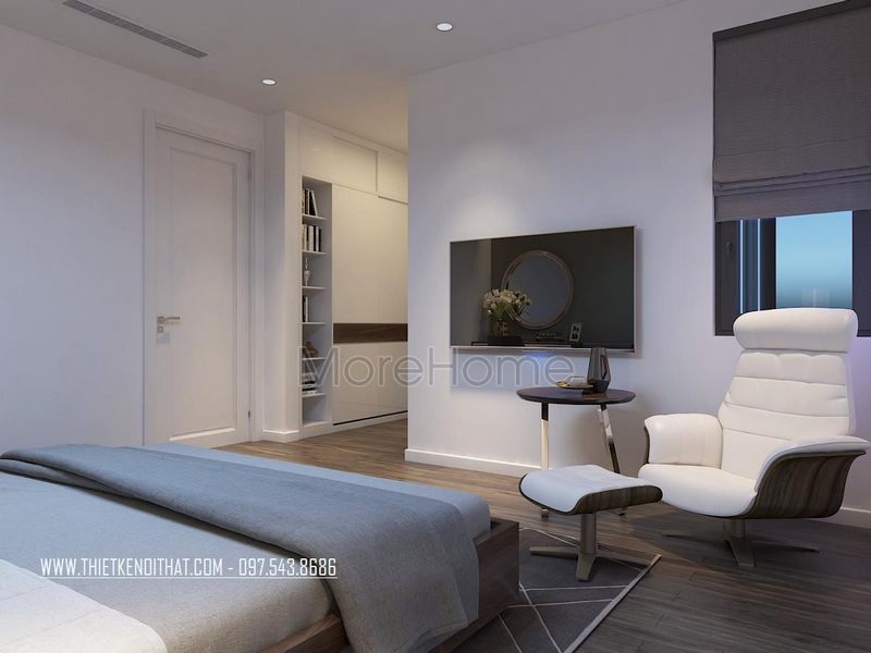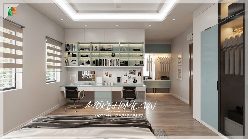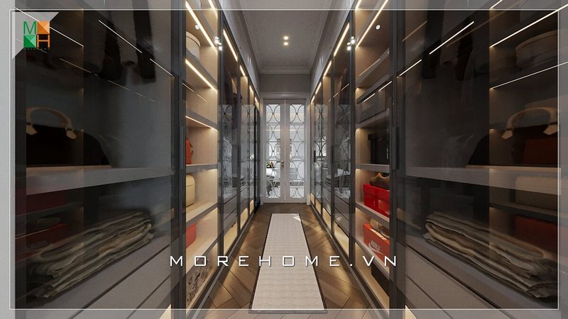 Thiết kế kệ tủ quần áo âm tường cũng góp phần lớn tiết kiệm không gian cho căn phòng