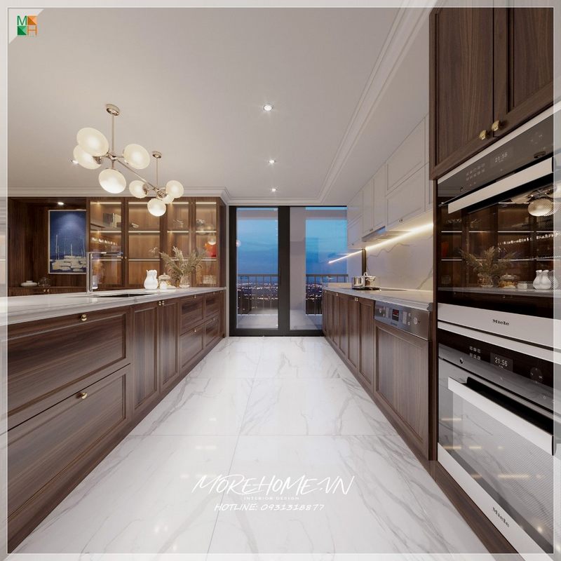 Mẫu thiết kế tủ bếp gỗ óc chó chữ U rất phù hợp cho không gian bếp biệt thự, căn hộ cao cấp.