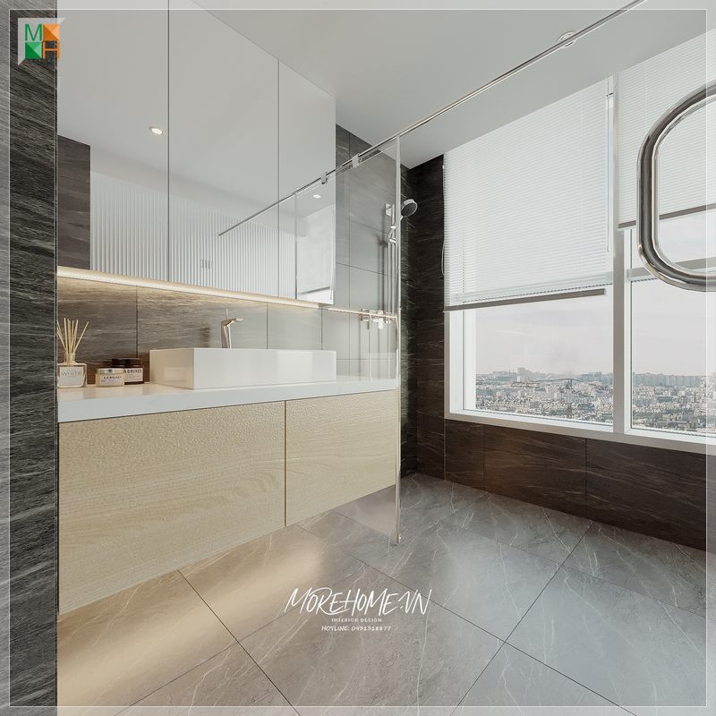 Phòng tắm thiết kế với gam màu trầm nội thất hiện đại mang tới không gian tiện nghi và thẩm mỹ cao.