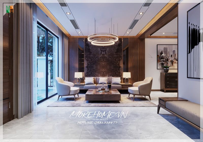 Sàn nhà phòng khách biệt thự, nhà phố được ốp bằng gạch màu sáng giúp cho phòng khách mới mẻ, hiện đại