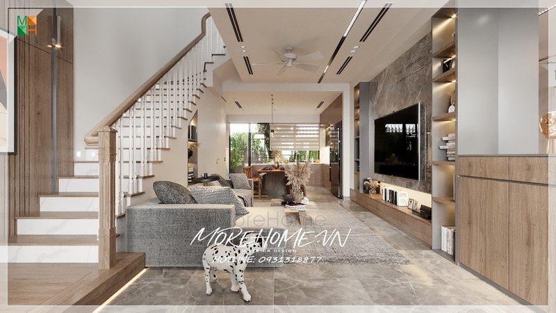Không gian hành lang tầng biệt thự được chuyển đổi thành một không gian phòng khách nhỏ hoặc một phòng sinh hoạt chung dành cho toàn bộ gia đình.